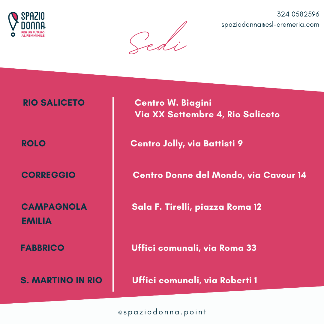 “Spazio donna” è il nome dello sportello, inaugurato a luglio 2022 presso il centro Wildmer Biagini, che offre un servizio gratuito di orientamento, formazione e attivazione delle donne nel mondo del lavoro e che consolida le politiche sul tema della parità messe in campo dall’Unione Comuni. Il progetto è promosso dall’Unione Comuni Pianura Reggiana e vede il sostegno della Regione Emilia-Romagna, nell’ambito delle iniziative a sostegno della presenza paritaria delle donne nella vita economica del territorio.