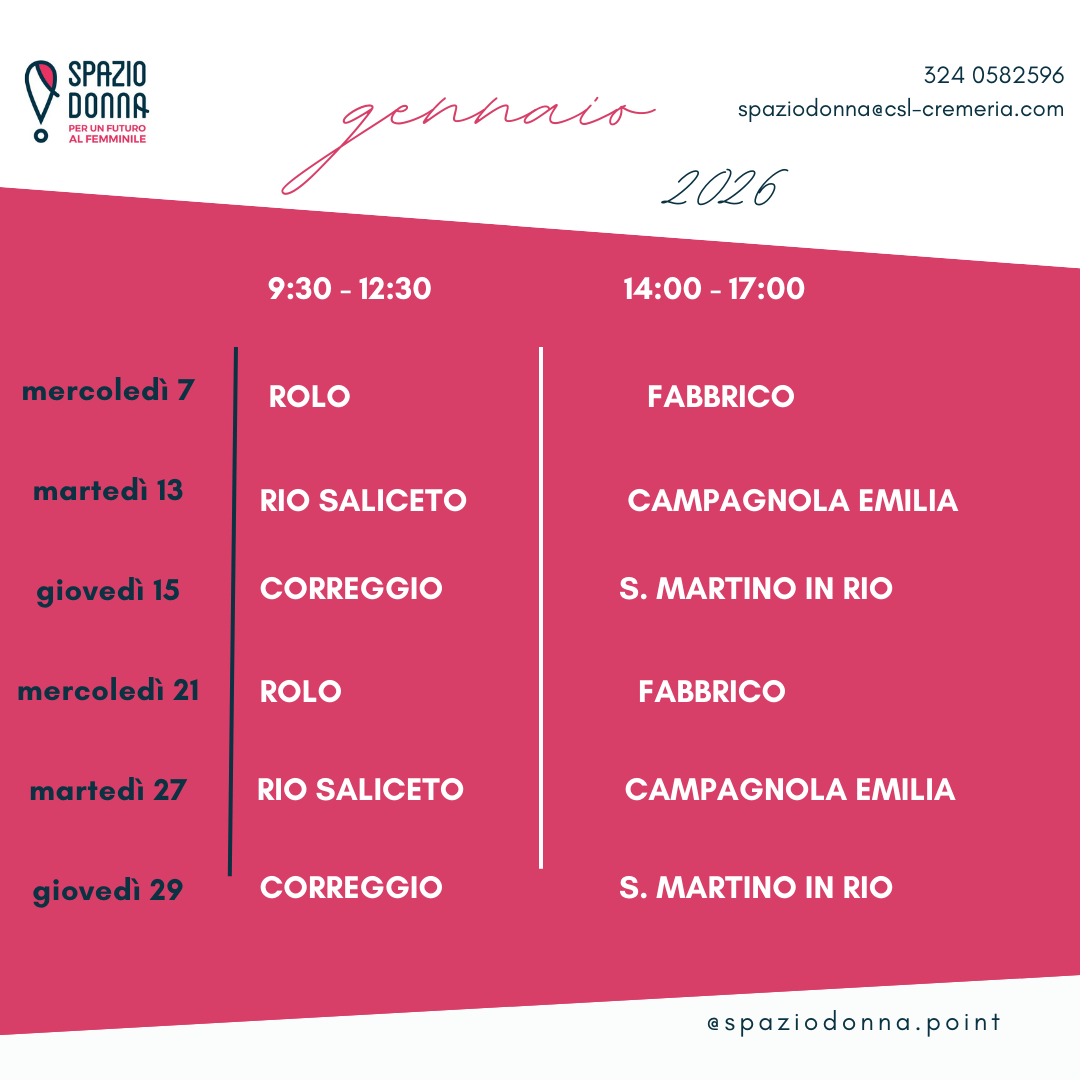 Lo stesso servizio, gestito dal personale del Centro Studio e Lavoro La Cremeria, è aperto in tutti i Comuni dell’Unione Pianura Reggiana (Rio Saliceto, Correggio, Campagnola Emilia, Fabbrico, Rolo e San Martino in Rio), con giornate e orari differenziati.
