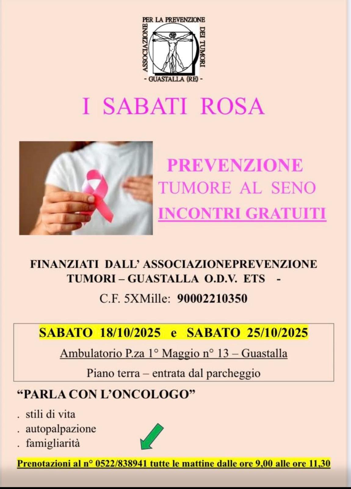 Incontri gratuiti promossi dall’Associazione Prevenzione Tumori Guastalla presso l’Ambulatorio di Piazza 1º Maggio n. 13 – Guastalla (piano terra, entrata dal parcheggio):